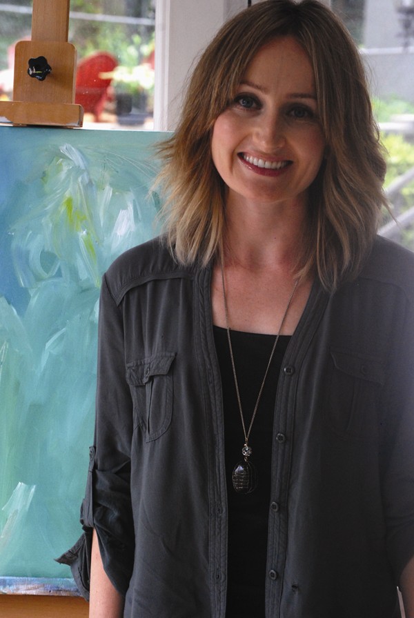 Paint pulls from the brush to the canvas. Ashley Hizer is working in her Decatur sunroom, the tile speckled with drops of acrylic paint. What’s taking shape isn’t a form or figure; rather, it’s an abstract panel with complementary and contrasting colors pulling texture to create the work.